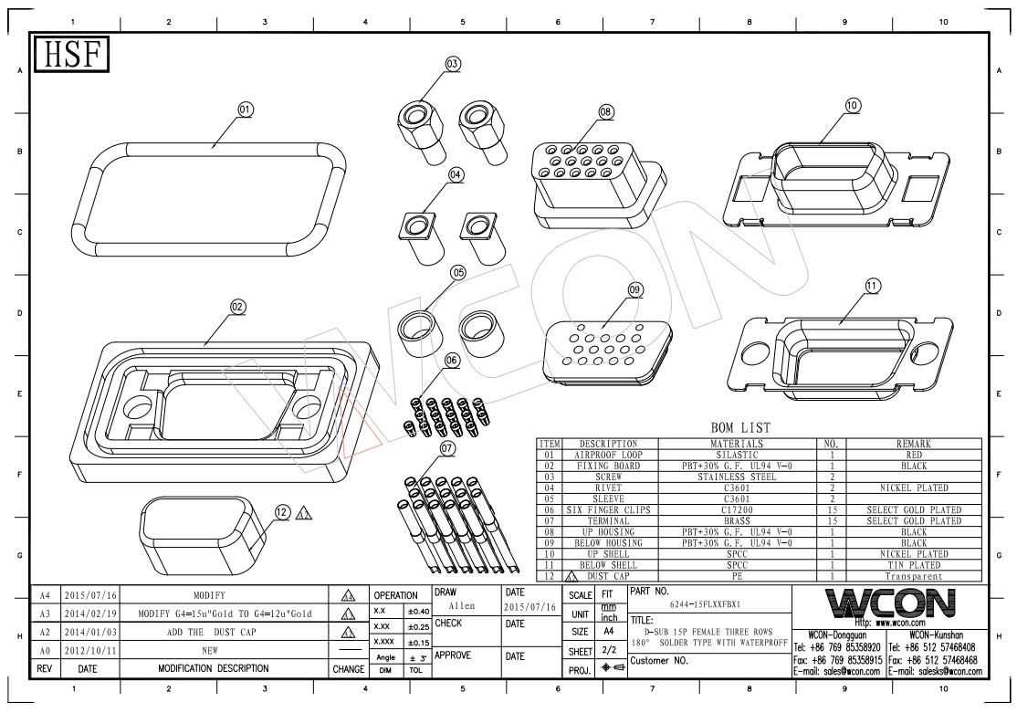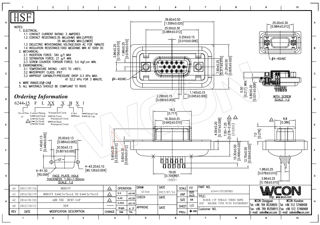 15P 母座 三排焊线式带前防水圈 防水型D-SUB