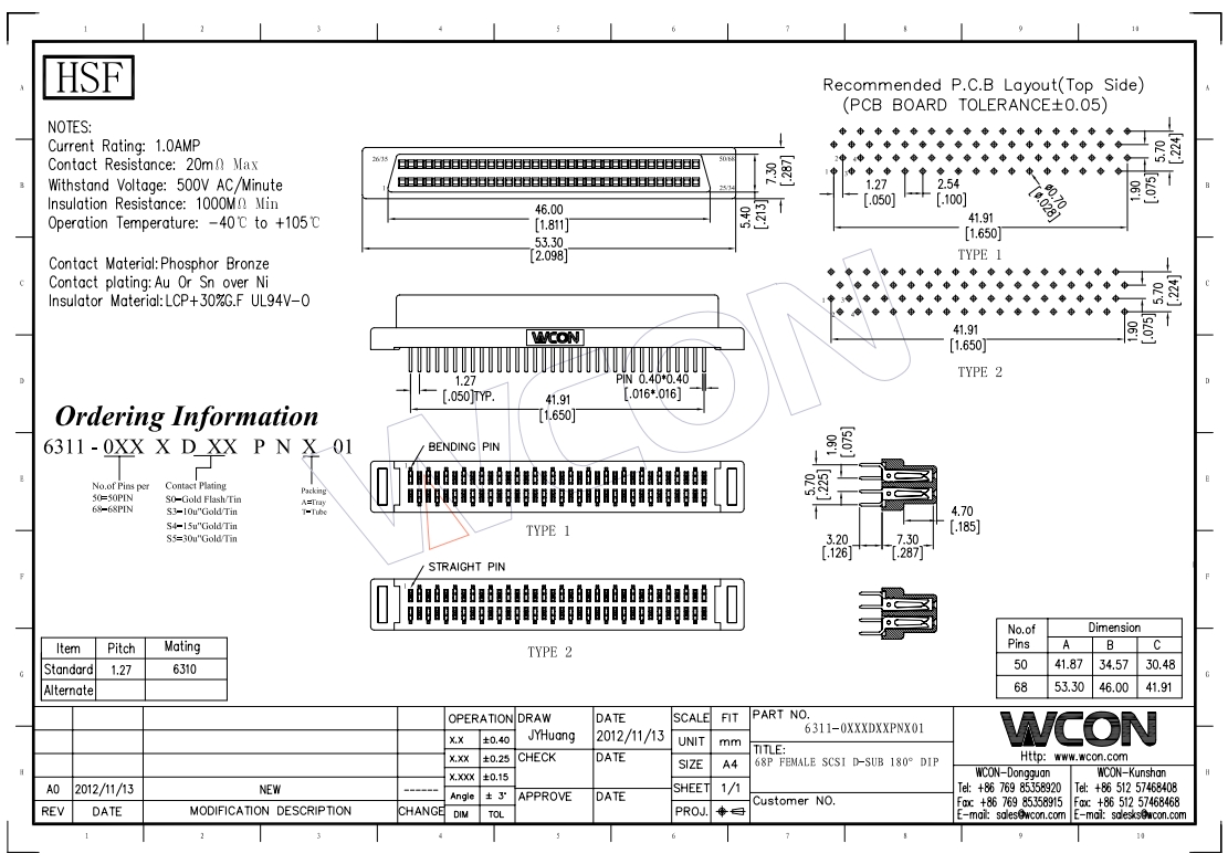 插板式 金属外壳 68P 带纵向鱼叉 SCSI 连接器