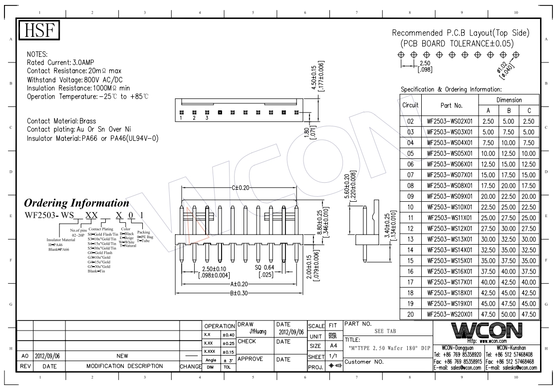 2.5间距 6P180°DIP Wafer 板对线 连接器