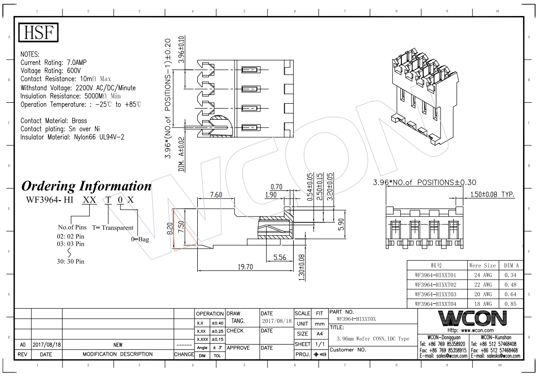 3.96MM 刺破式 单边出线有防呆Housing Wafer