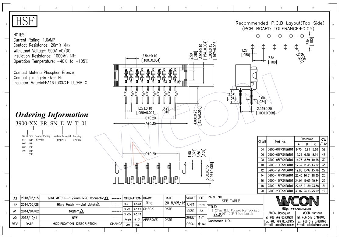 PA46 红色1.27mm MRC 8P母座,90度DIP,右防呆,二端有耳扣 镀锡 环保