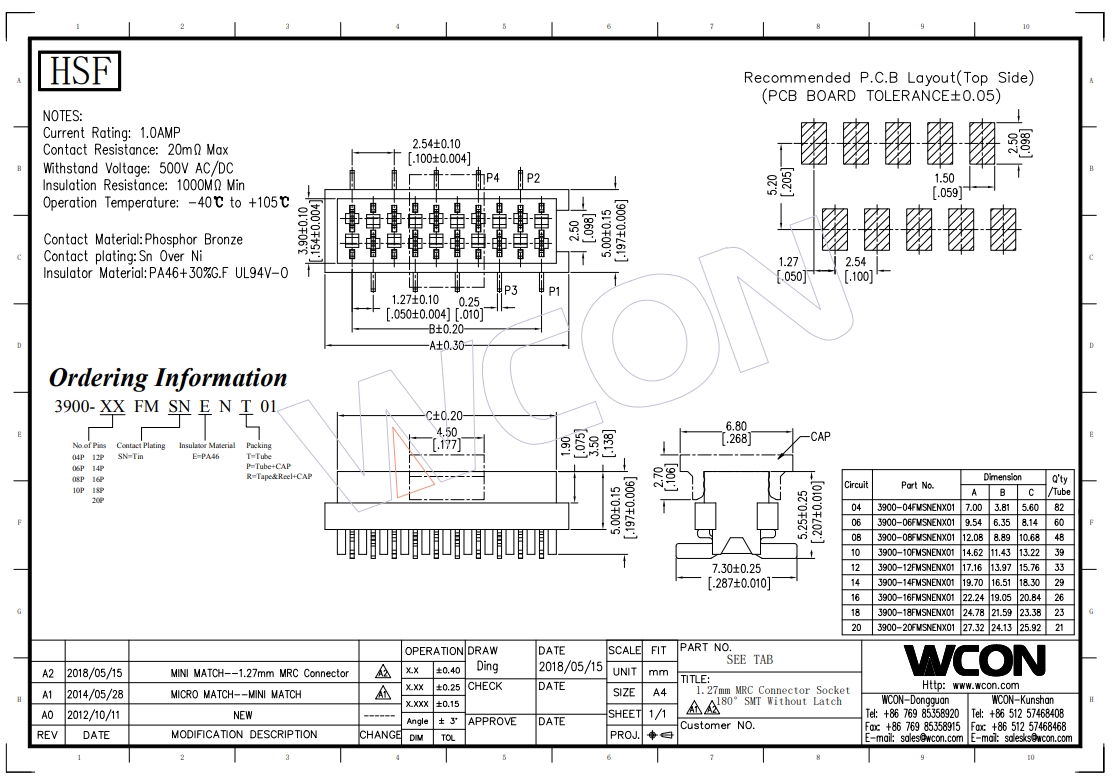 1.27mm MRC 连接器 4P 母座,SMT Type,无耳PA46红色 镀锡 环保