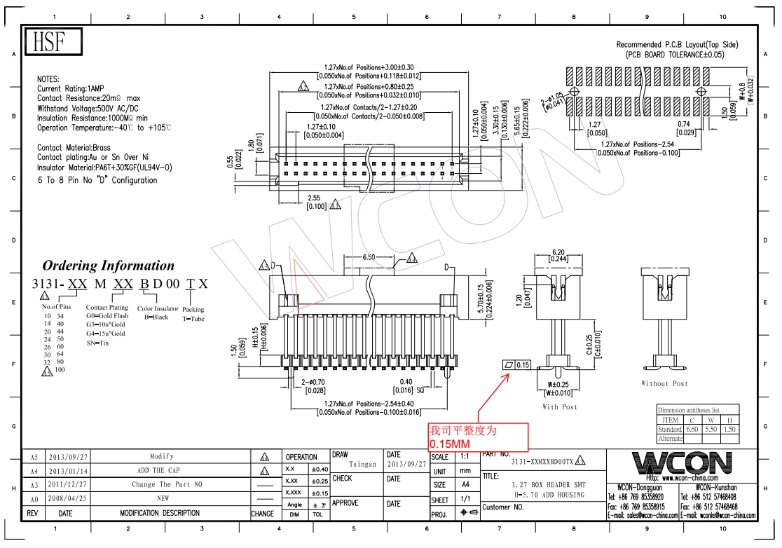 1.27MM H=5.7 180°SMT 正向加塑胶 简牛