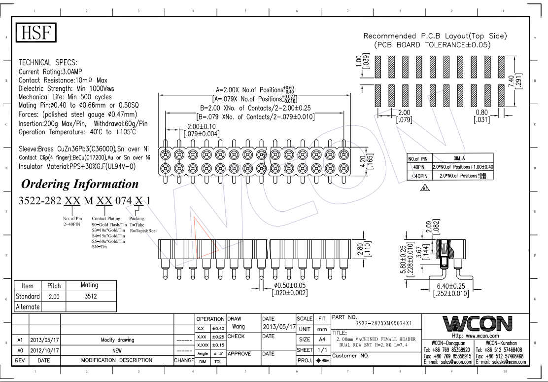 2.0MM 双排 180° SMT 圆孔排母