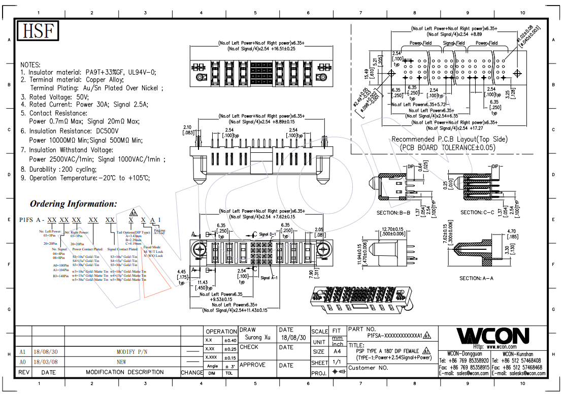 PSP 180度直插型 带柱 母座 电源与信号混装连接器