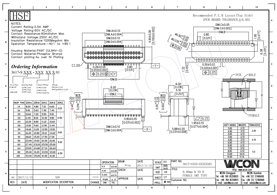 0.8MM 板对板 母头 带柱 PA9T本色 H1=5.2