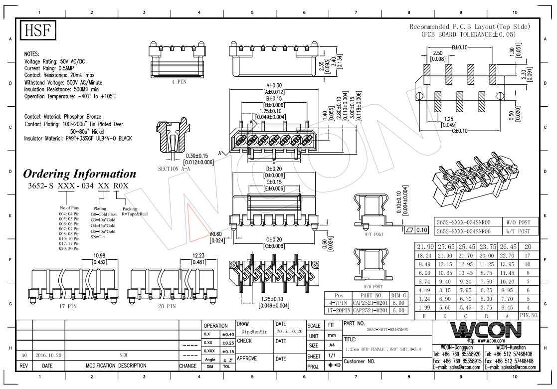 ROHS 环保 1.25间距 板对板母头 H=3.4 单排 180度贴片