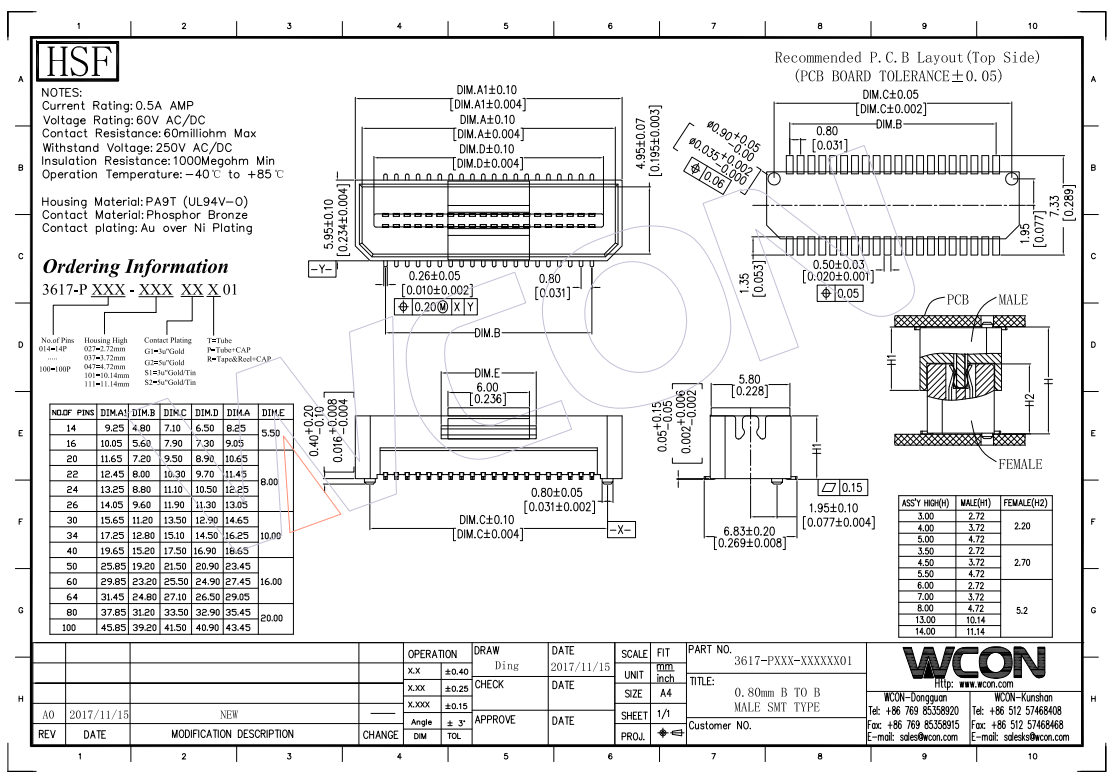 0.8MM 板对板 公头 带柱 PA9T本色 H1=4.72