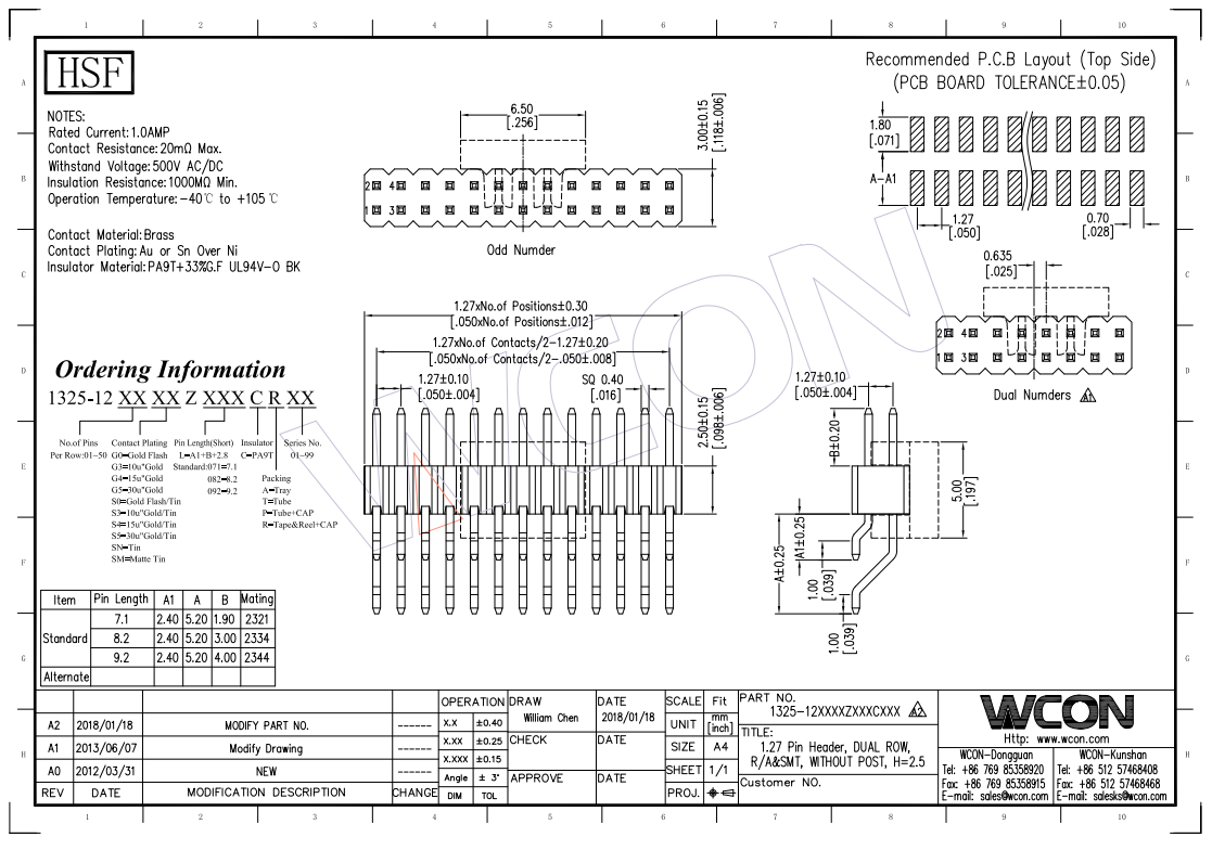 1.27MM 单层双排 90°贴片式(Type A) 排针