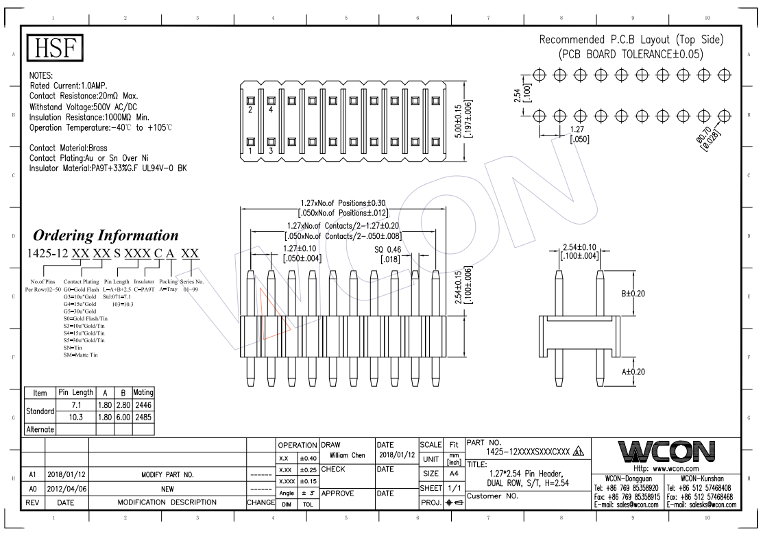 WCON 1.27*2.54 单层双排 直针 排针