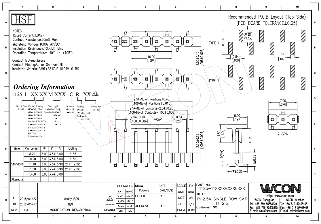 2.54MM 单排 180° SMT 排针