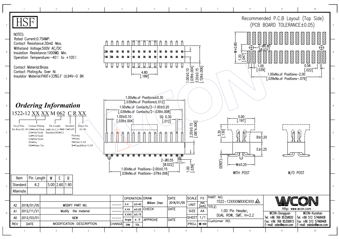 1.0 MM 单层双排 180° SMT 排针