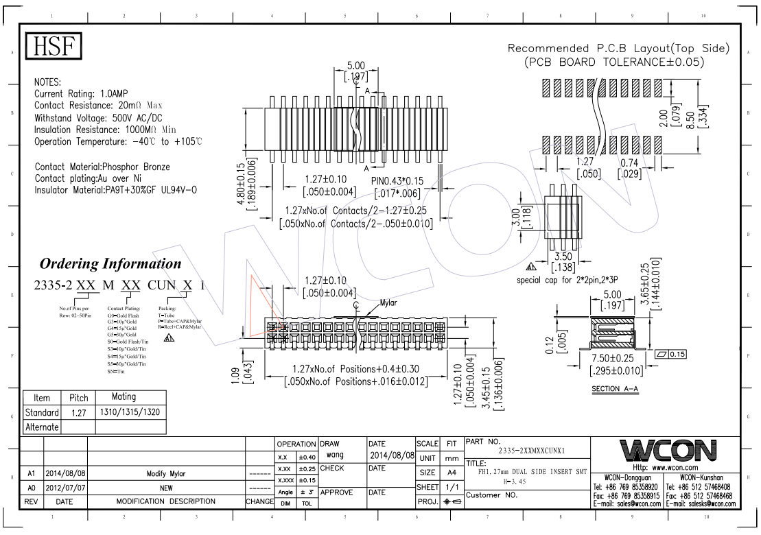 1.27MM 双排 180度SMT 侧插型 排母 H=3.5