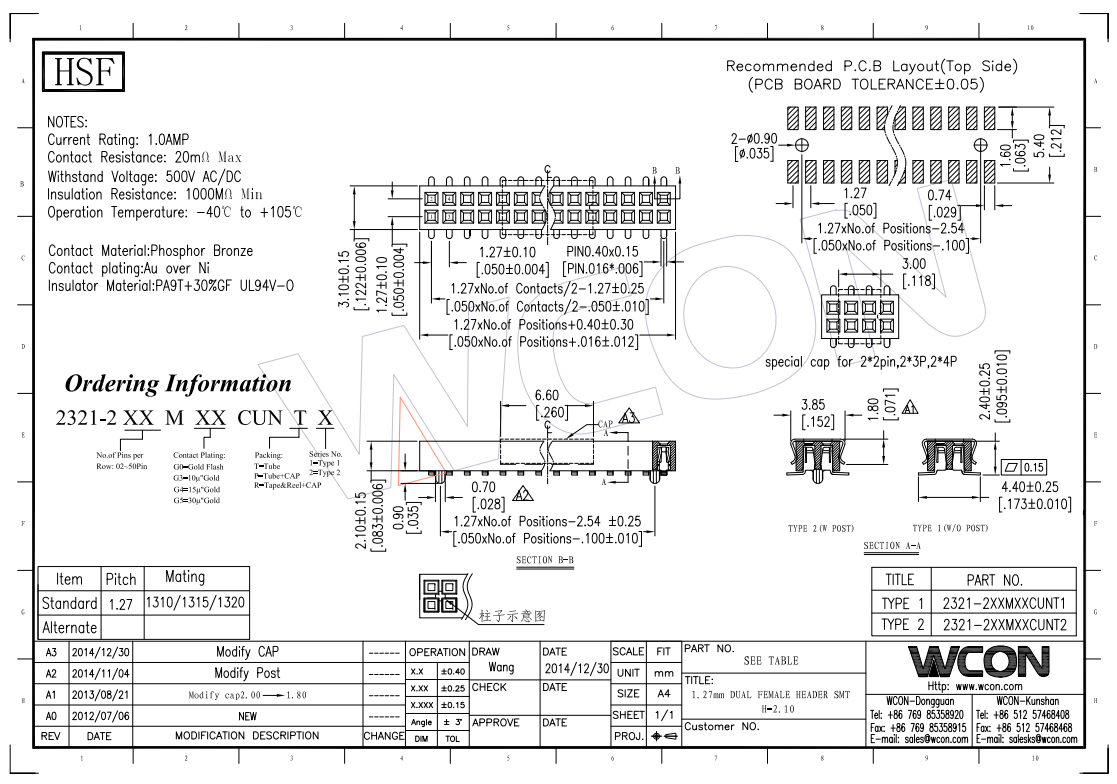 1.27MM 双排PA9T 180° SMT 排母 H=2.1