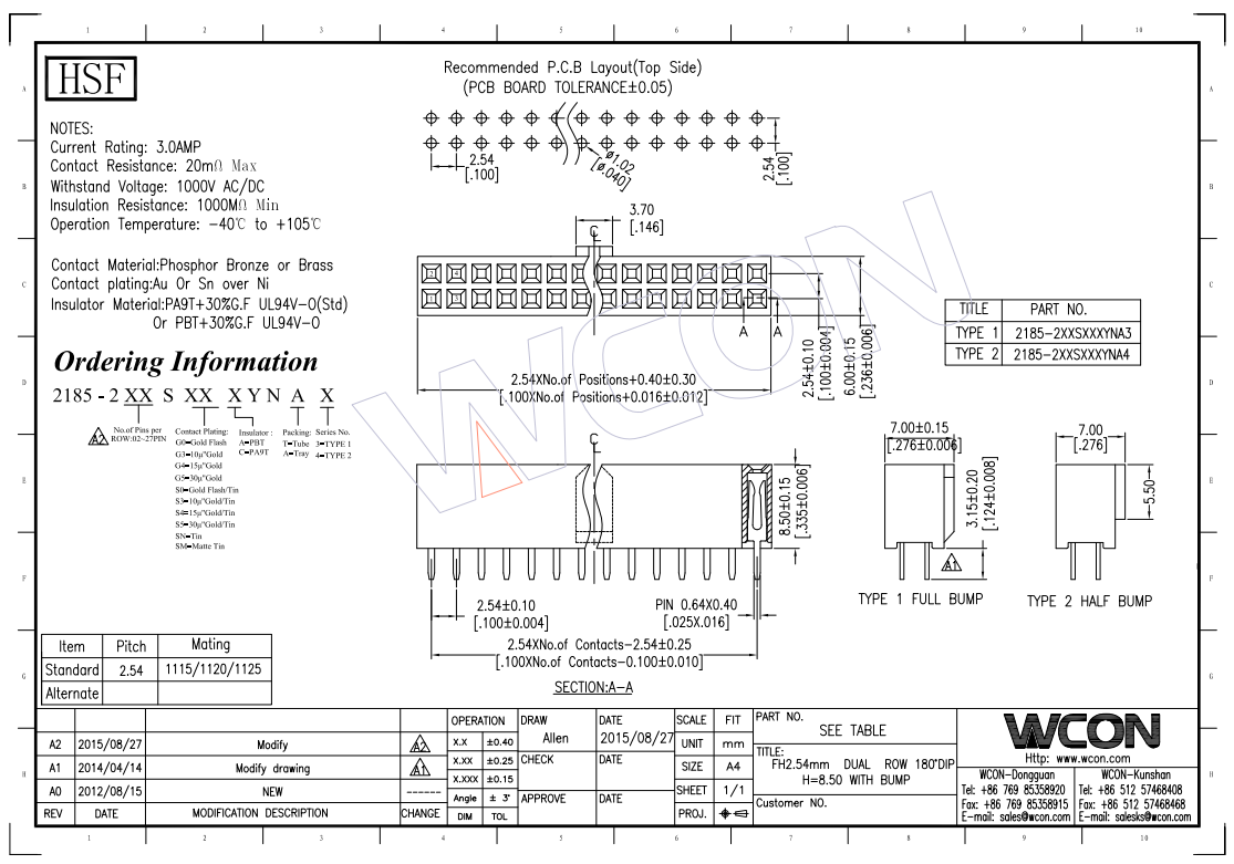 2.54MM H=8.5MM 带凸点 双排 180°DIP 排母 连接器