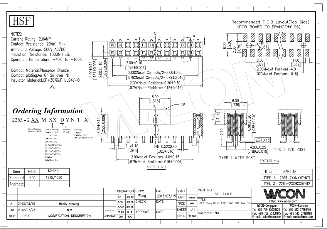 2.0MM H=6.3MM 双排 180° SMT排母 批发