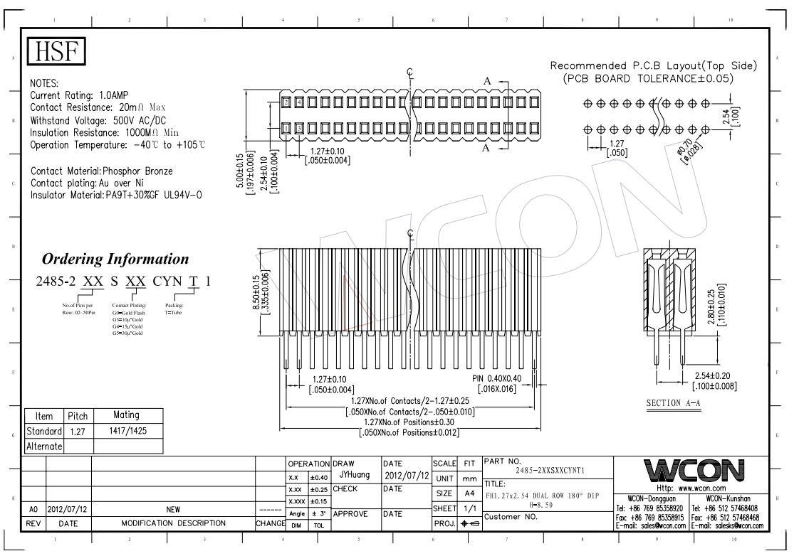 1.27*2.54MM H=8.5MM 双排 180°DIP 排母